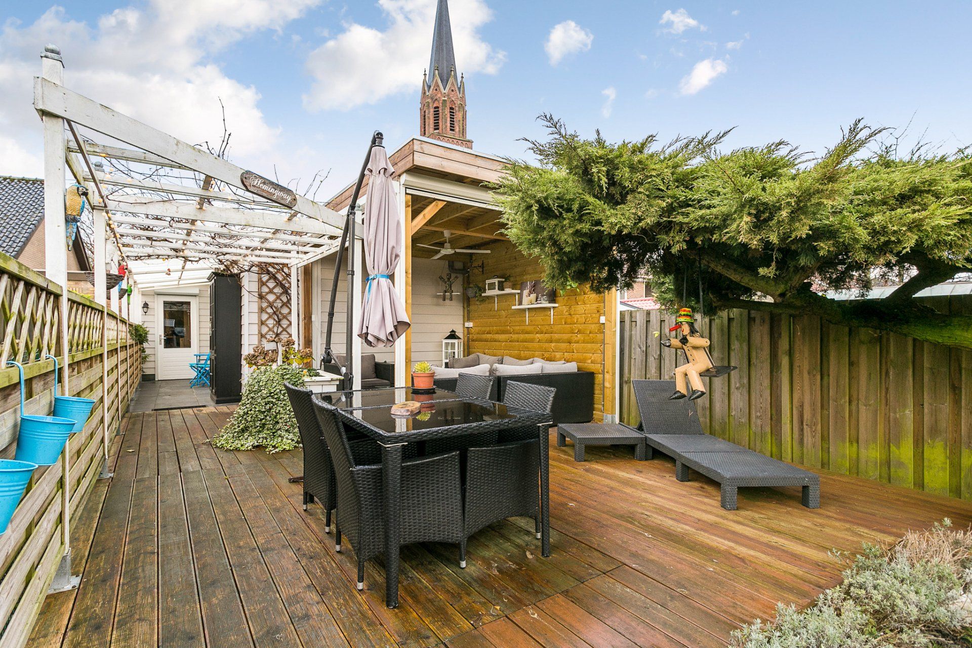 De tuin is ook een echte pareltje, hier geniet je de hele dag van de zon en je privacy. Recent hebben de eigenaars nog een stukje tuin bijgekocht aan de achterkant zodat er nu directe toegang tot het plein aan de Rozenstraat is aan de achterzijde, over eigen grond.