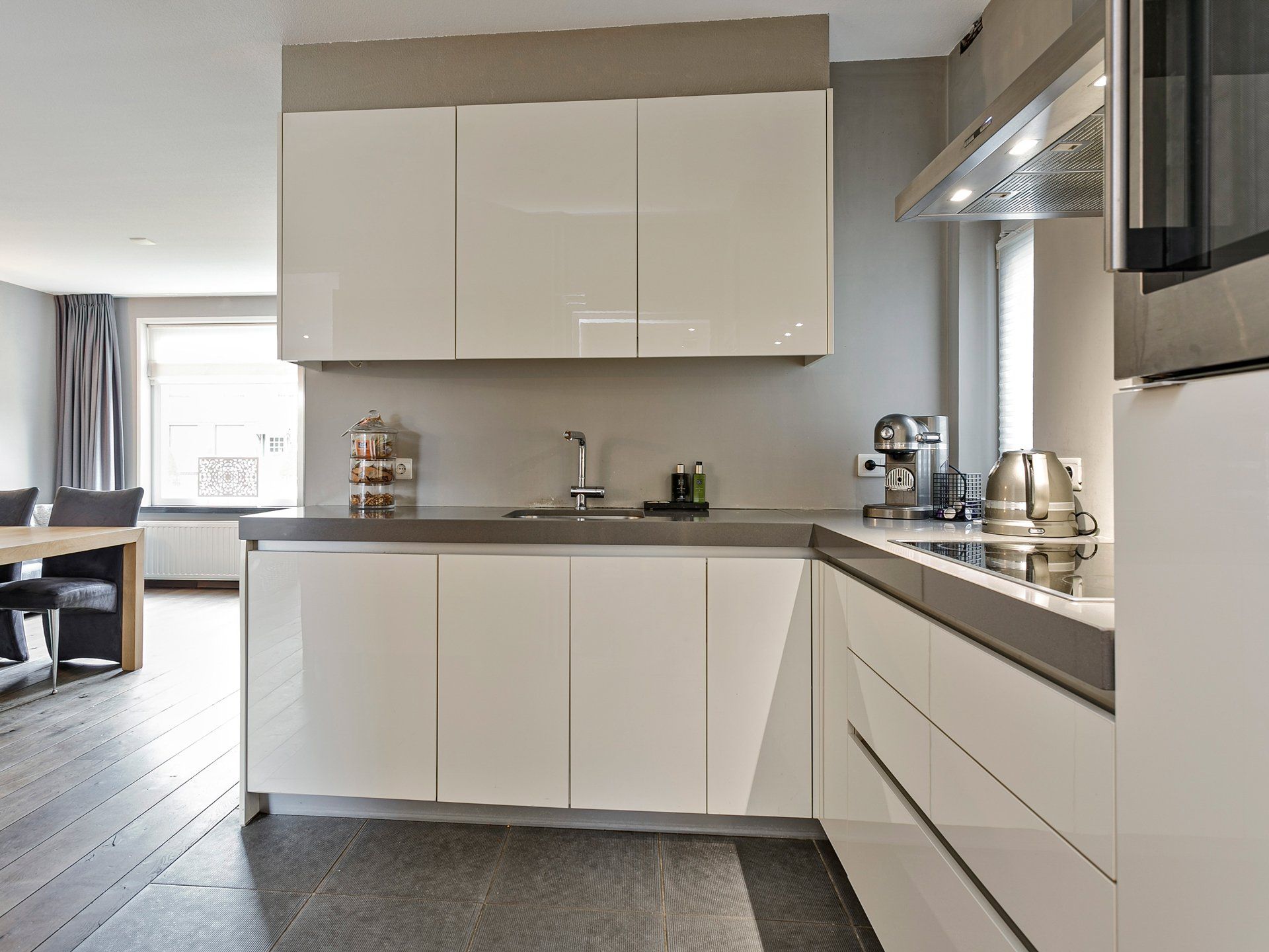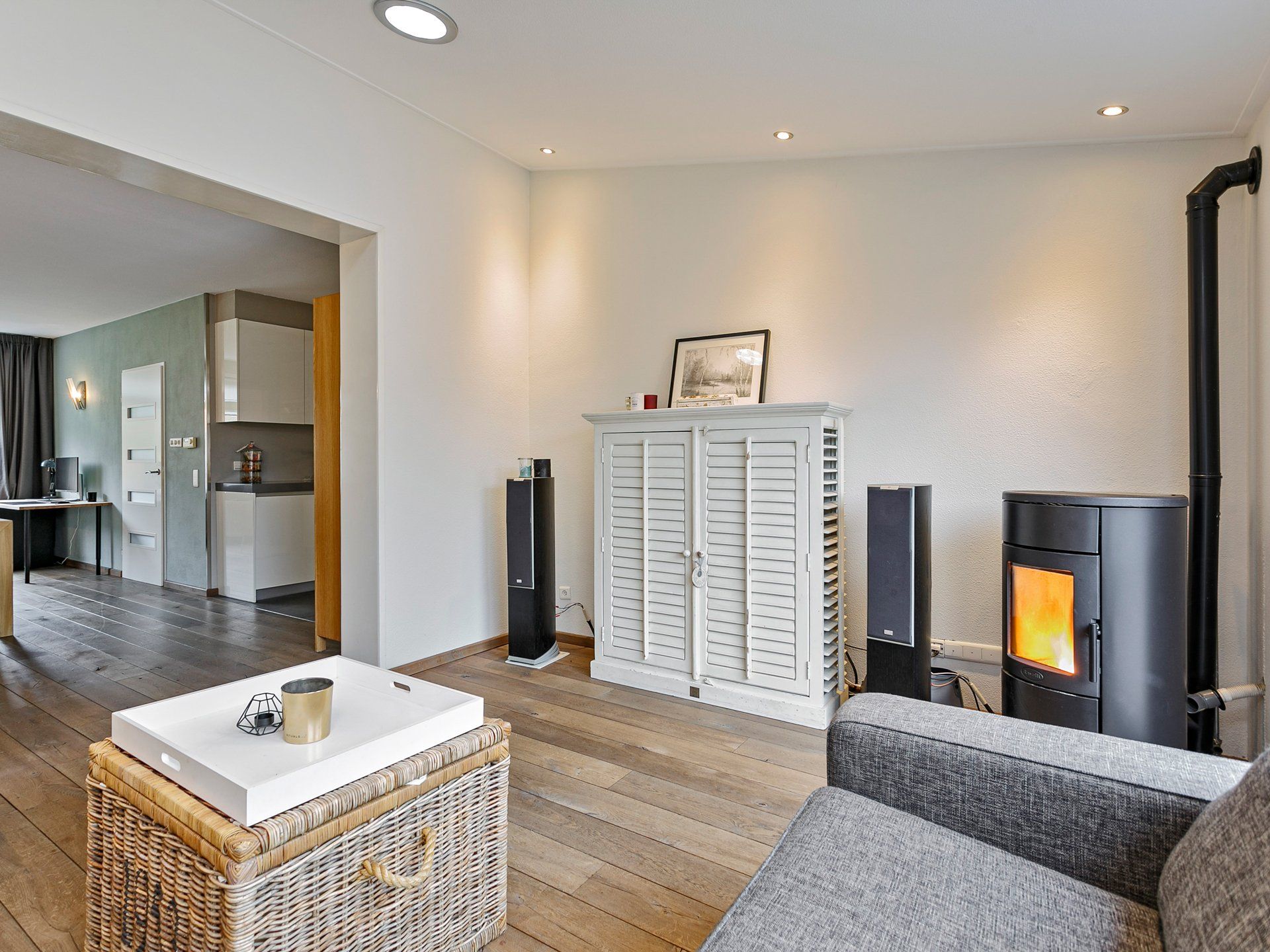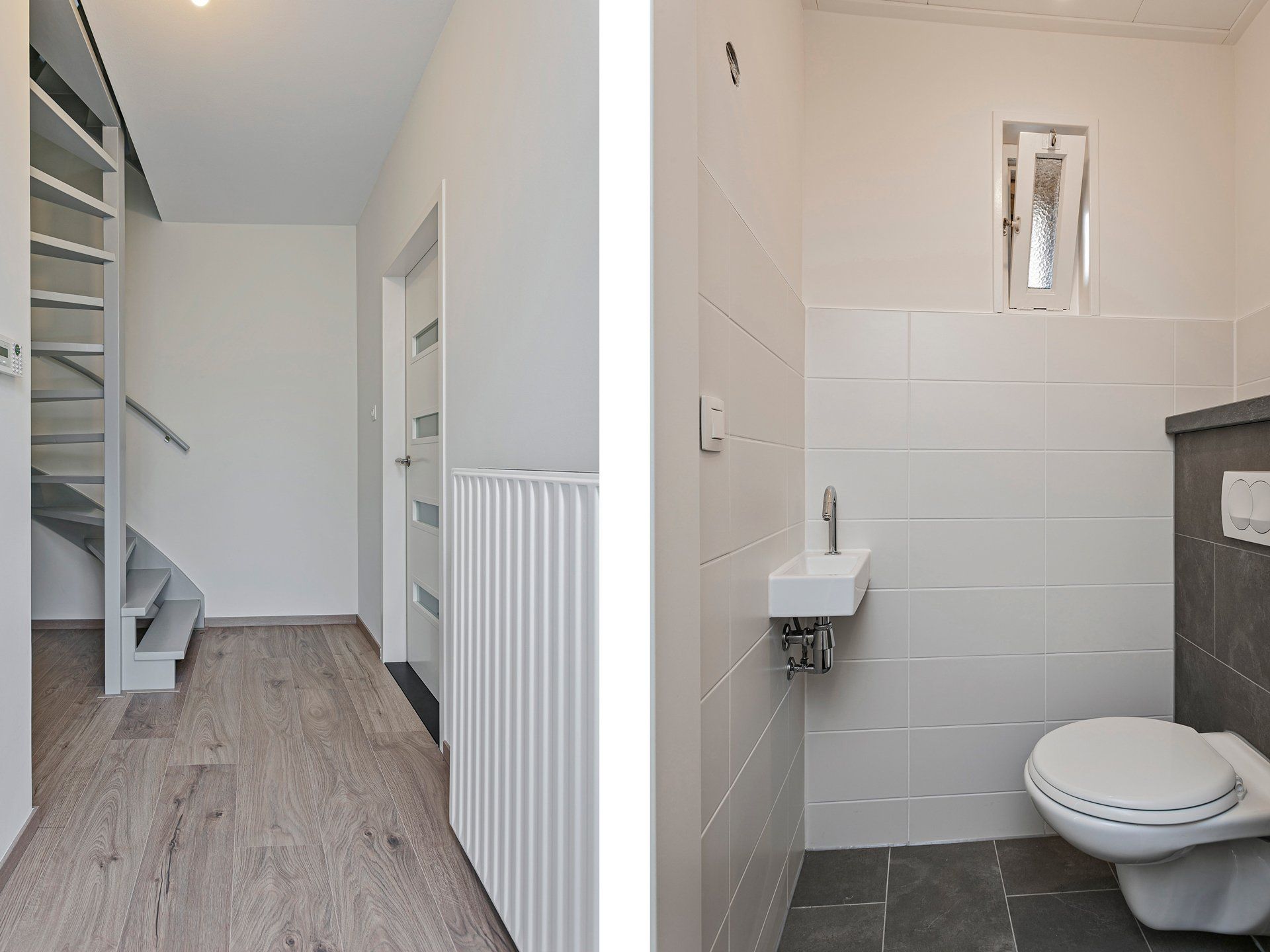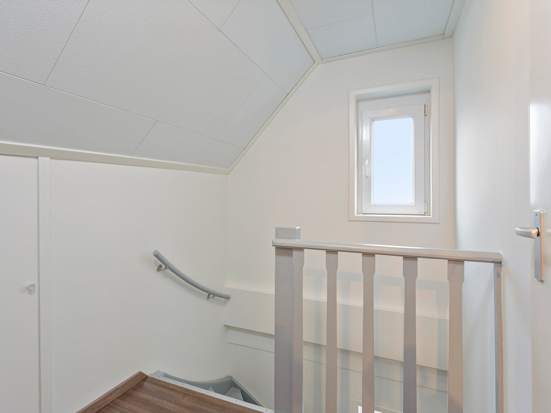 Via de vaste trap in de hal kom je op de overloop. De verdiepingsvloer is van beton en de plafonds zijn hier extra geïsoleerd onder de houten zoldervloer. De hele verdieping is voorzien van een laminaatvloer met uitzondering van de badkamer. Hier ligt een mooie donkere tegelvloer.