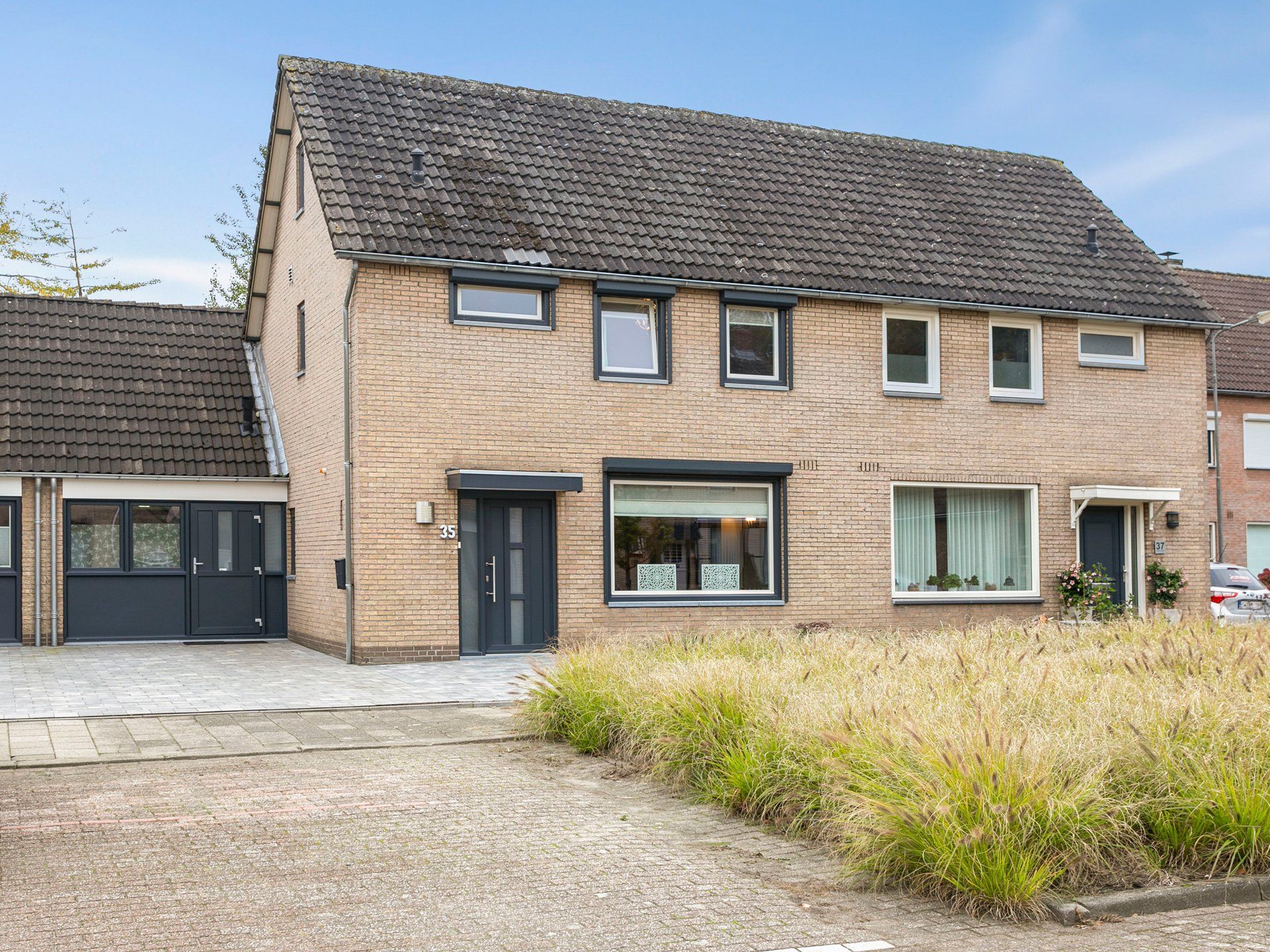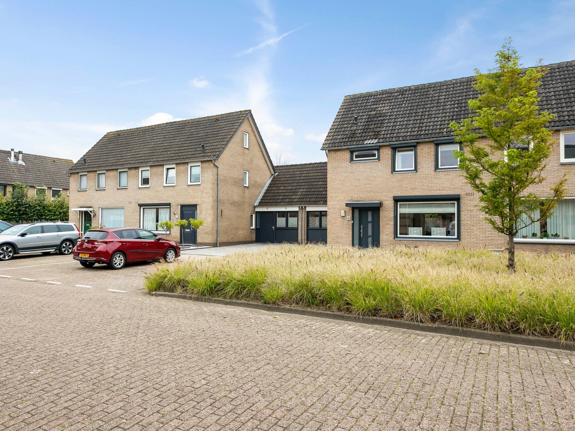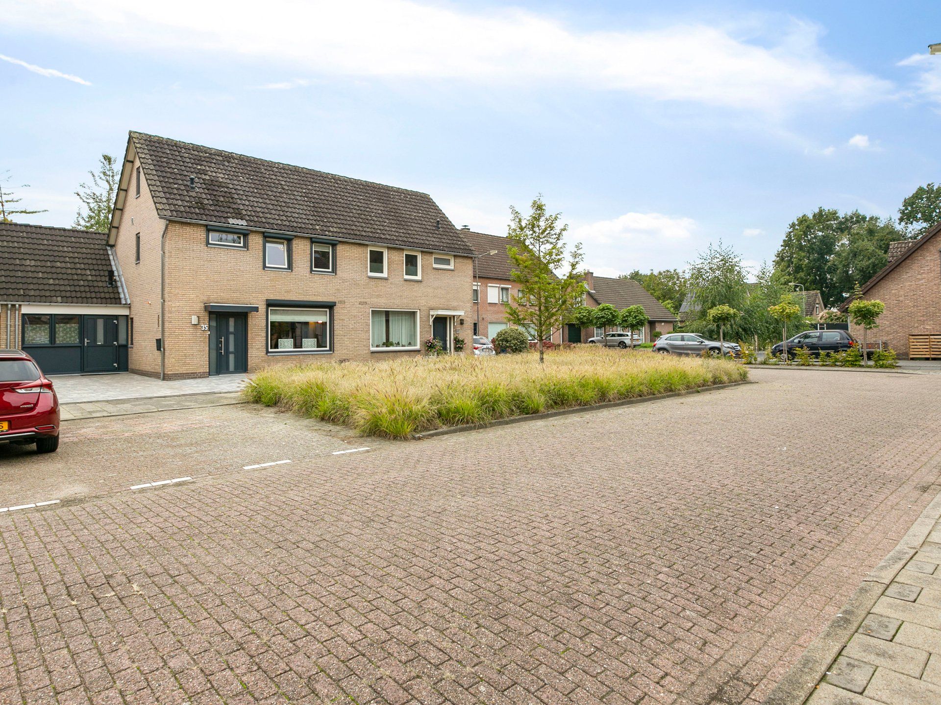 Aan de voorkant van de woning is de tuin onderhoudsvriendelijk ingericht met een strook vaste planten. De ruime oprit biedt plaats aan twee auto’s. Daarnaast liggen aansluitend voldoende parkeervakken waar gratis geparkeerd kan worden.
