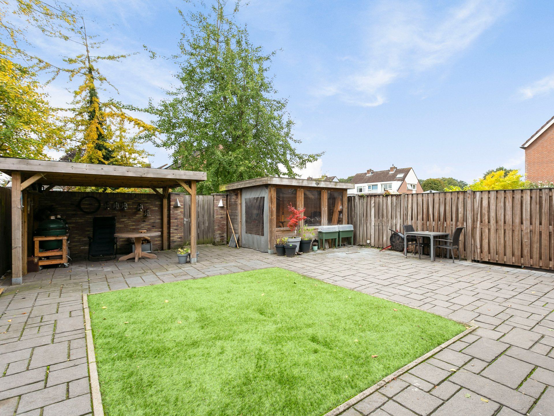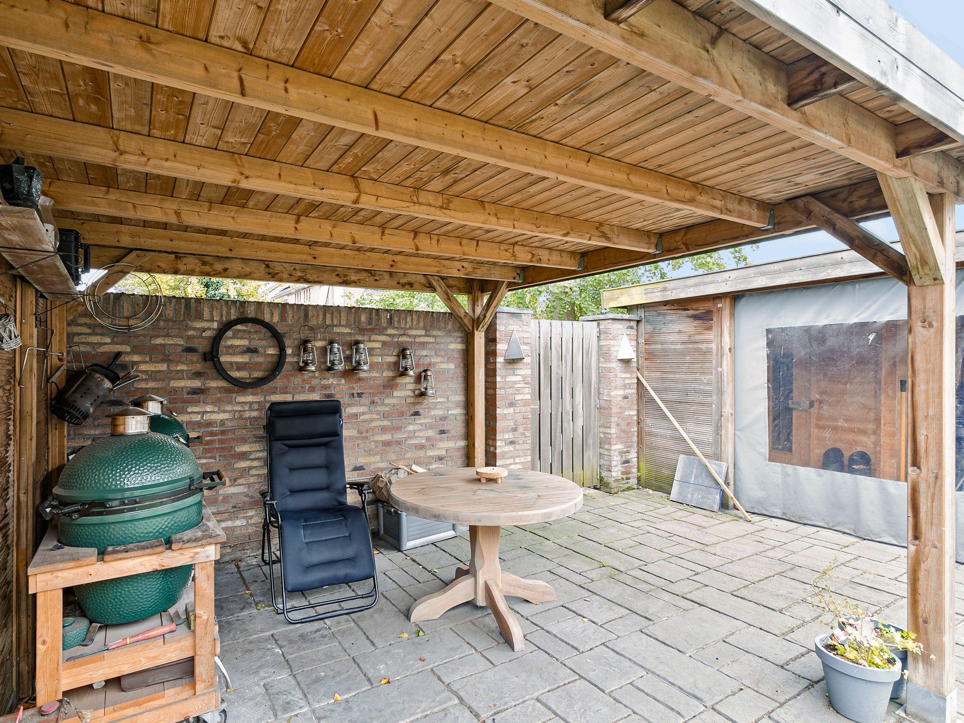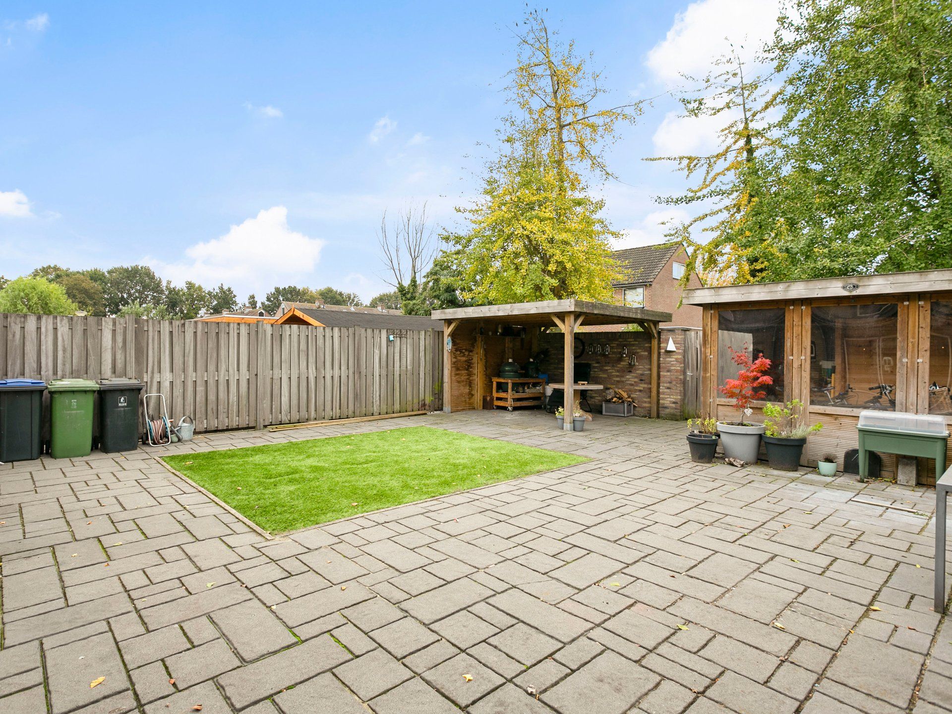 Achter in de tuin vind je twee overkappingen, de eerste is afsluitbaar met kunststof zeildoek en hier kun je fietsen en andere spullen droog stallen. Onder de tweede overkapping is ruimte voor een heerlijke loungeset om tijdens warme dagen te genieten van het buitenleven en heb je altijd een lekker plaatsje in de schaduw met veel privacy. Tussen de twee overkappingen in zit de doorloop naar de houten poort die uitkomt op een brede groenstrook en voetpad van de gemeente. Hier vind je links op 50 meter een leuk speeltuintje voor de kinderen uit de buurt.