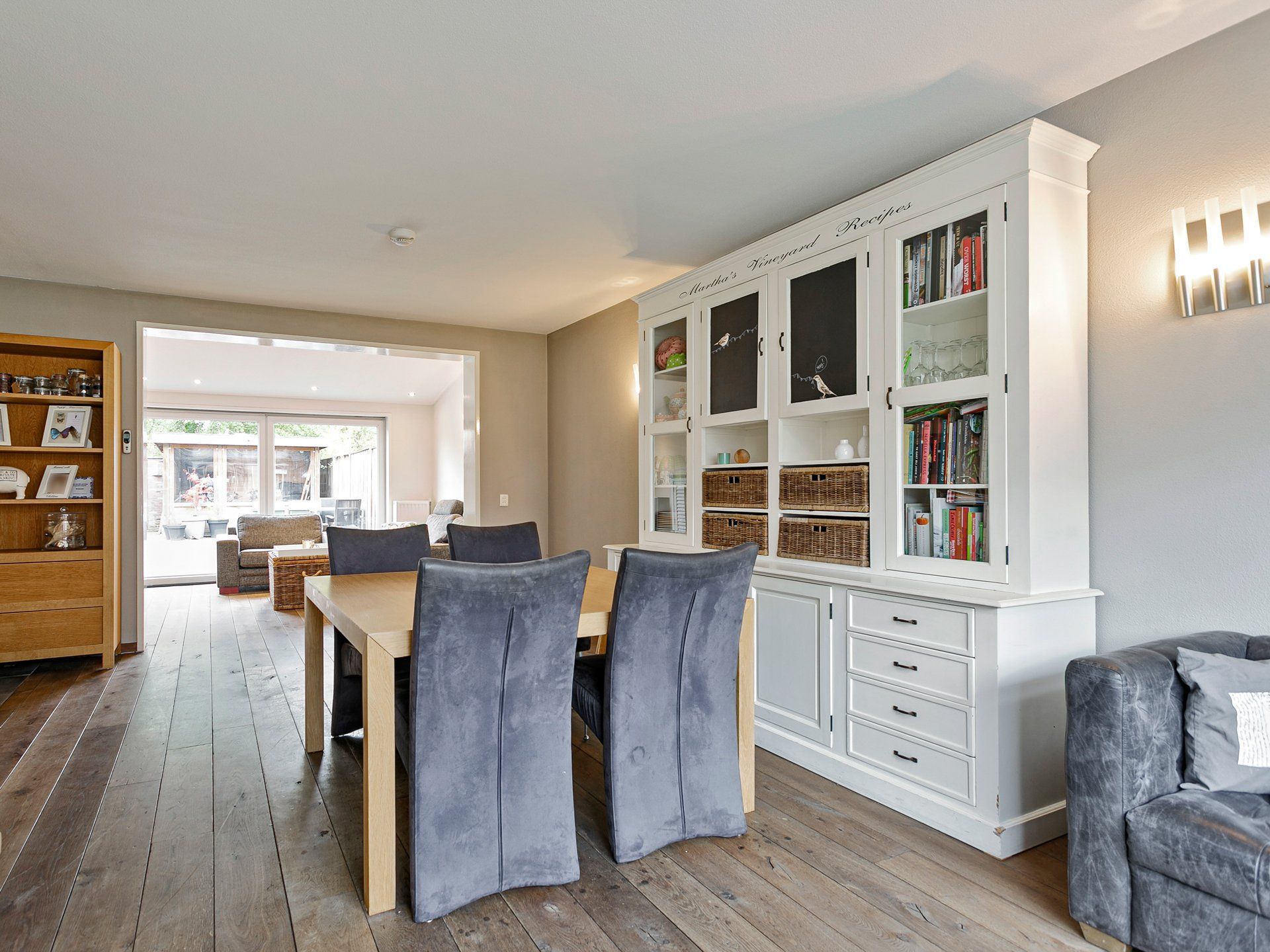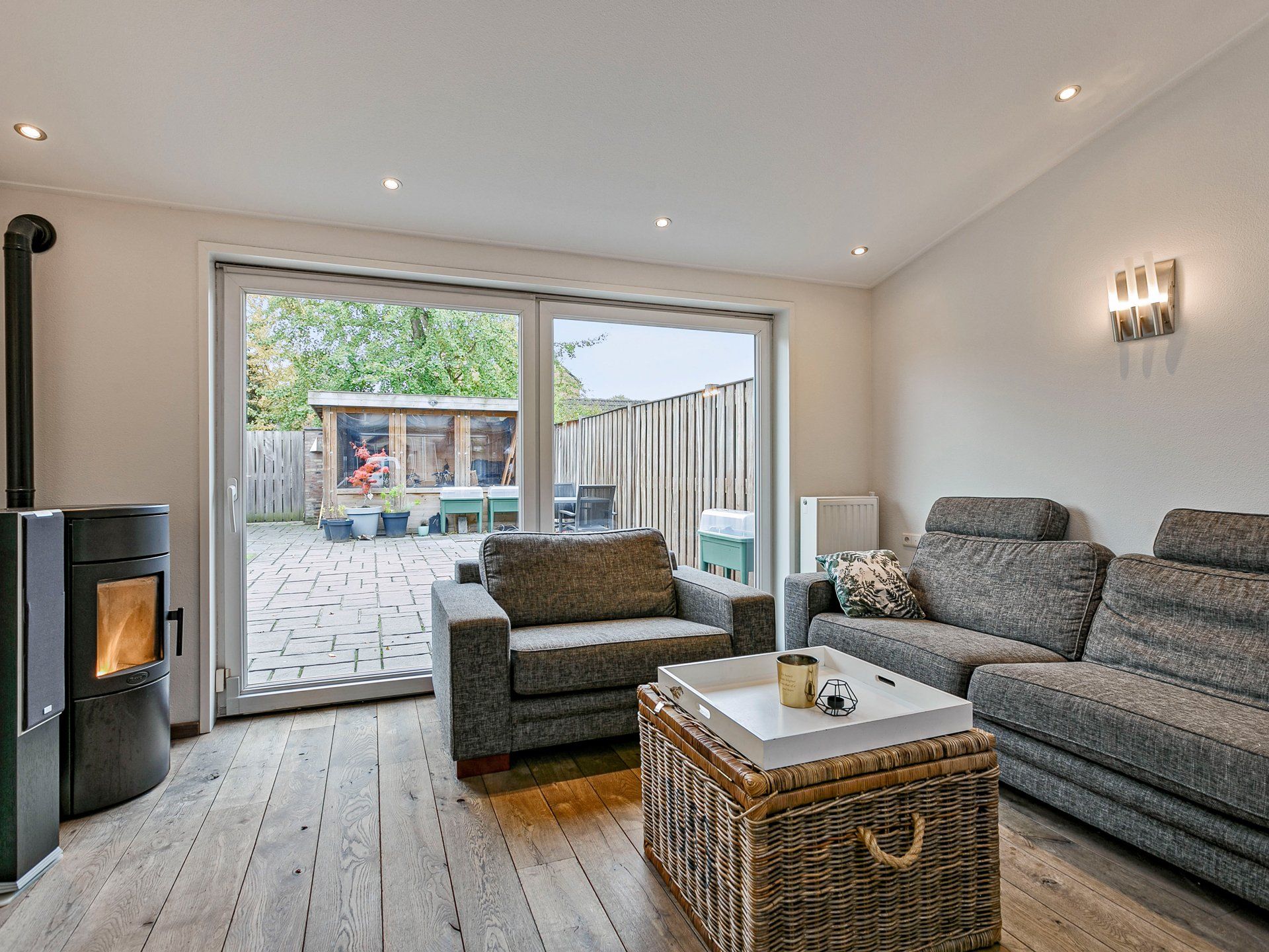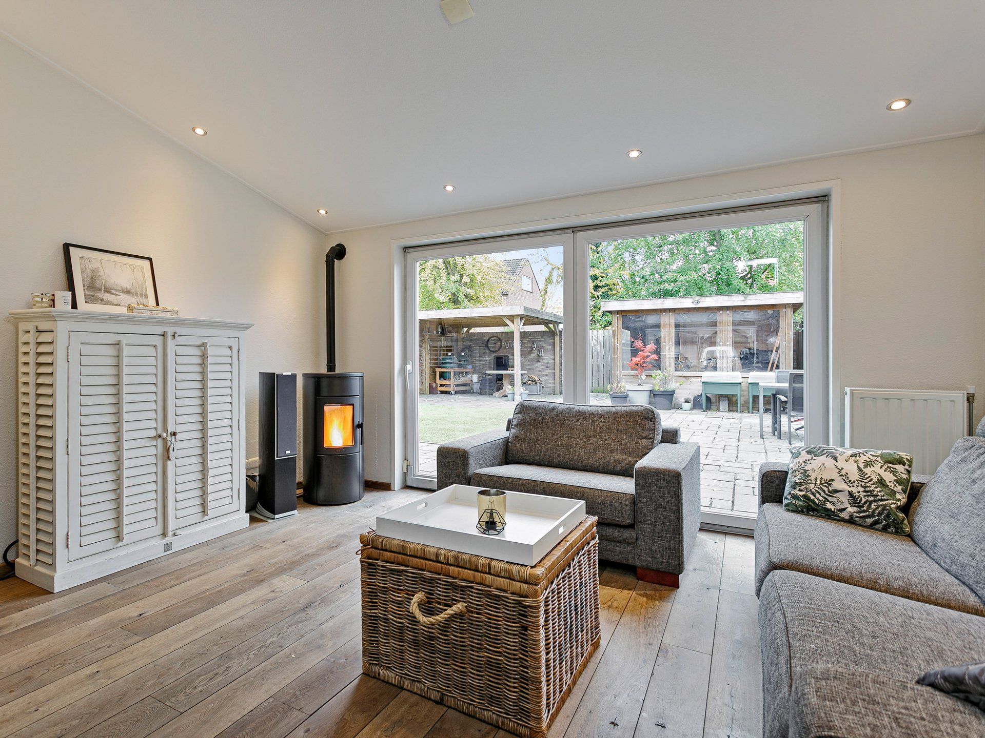 Achter in de tuin vind je twee overkappingen, de eerste is afsluitbaar met kunststof zeildoek en hier kun je fietsen en andere spullen droog stallen. Onder de tweede overkapping is ruimte voor een heerlijke loungeset om tijdens warme dagen te genieten van het buitenleven en heb je altijd een lekker plaatsje in de schaduw met veel privacy. Tussen de twee overkappingen in zit de doorloop naar de houten poort die uitkomt op een brede groenstrook en voetpad van de gemeente. Hier vind je links op 50 meter een leuk speeltuintje voor de kinderen uit de buurt.