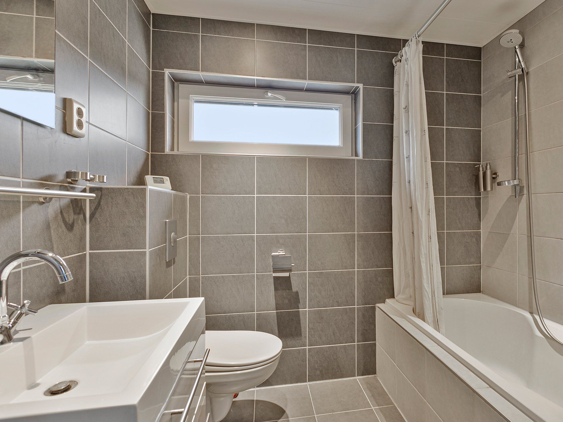 De badkamer ligt aan de voorzijde van de woning en bevat wastafelmeubel, een ligbad met daarin ook de douche en een toilet. De wanden zijn afgewerkt met tegels tot aan het plafond en er hangt een moderne radiator die zorgt voor lekkere warme handdoeken.