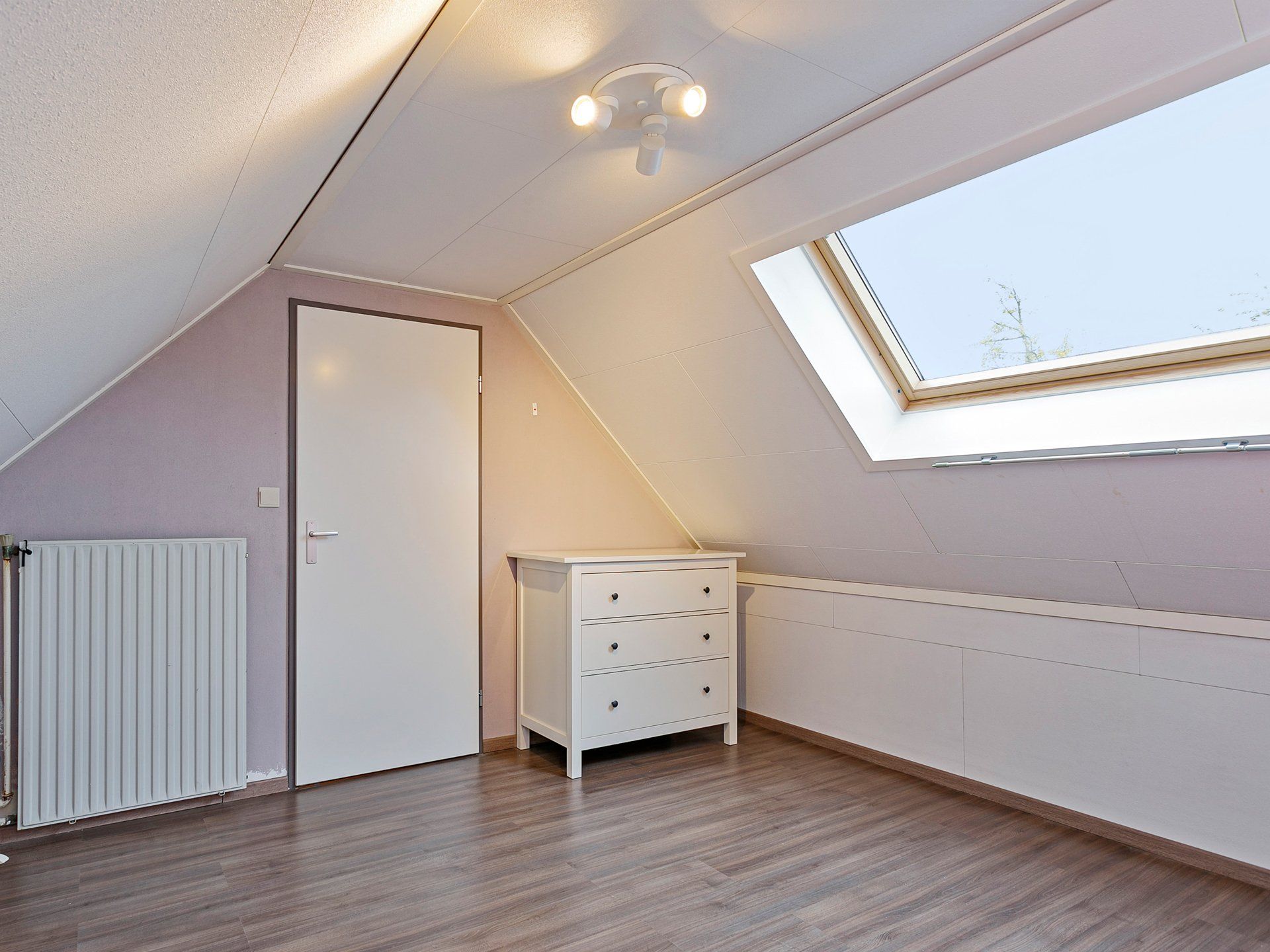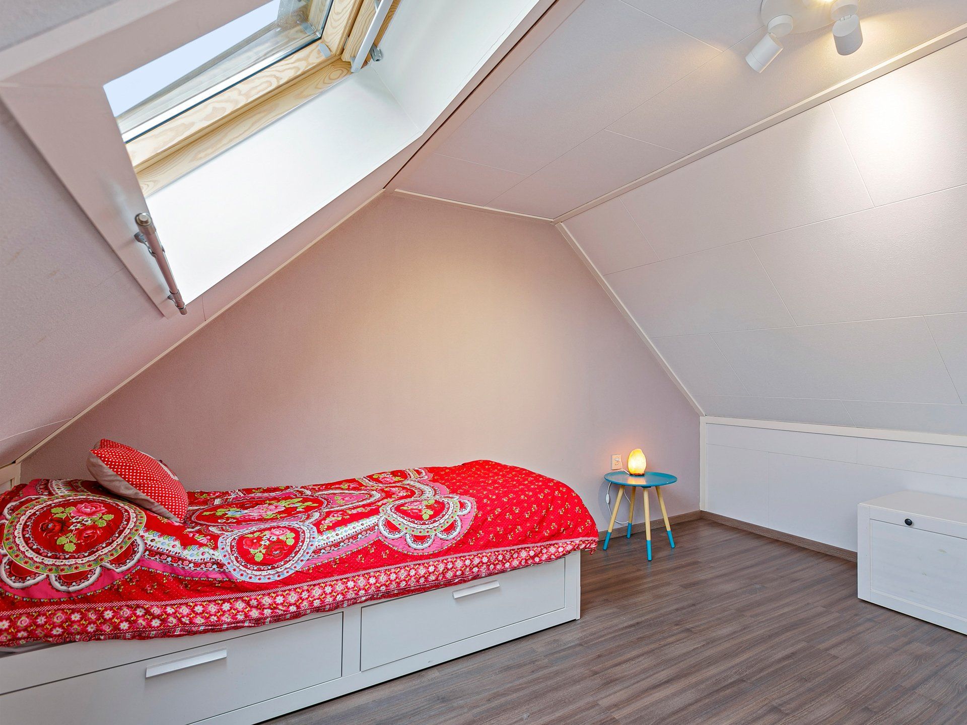 Op de overloop kun je met de vaste trap naar zolder waar zich nog een ruime vierde slaapkamer vindt met een groot dakraam. Dit dakraam is voorzien van een handbedienbaar rolluik. Op de vloer ligt een keurige laminaatvloer. Naast de ruime slaapkamer bevindt zich nog een kleine kamer waar de cv-ketel hangt. Ook zit er op de overloop op zolder een deur in het knieschot waar nog wat extra opbergruimte zit.