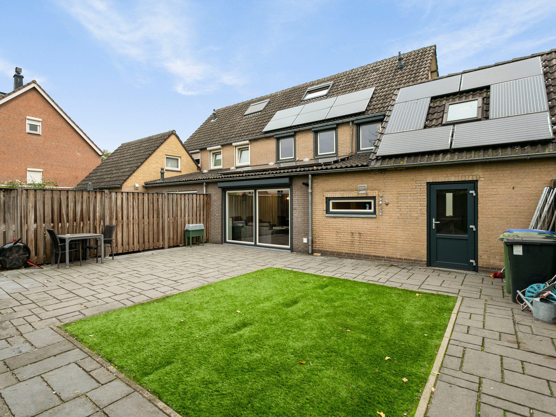 De achtertuin is gelegen op het zuidwesten en deze is vrijwel onderhoudsvrij. De fraaie tegels geven de tuin een vriendelijk en speelse aanblik en het gras is het hele jaar door groener dan bij de buren. Deze kunststof grasmat hoef je nooit te maaien maar geeft wel wat kleur in je tuin.