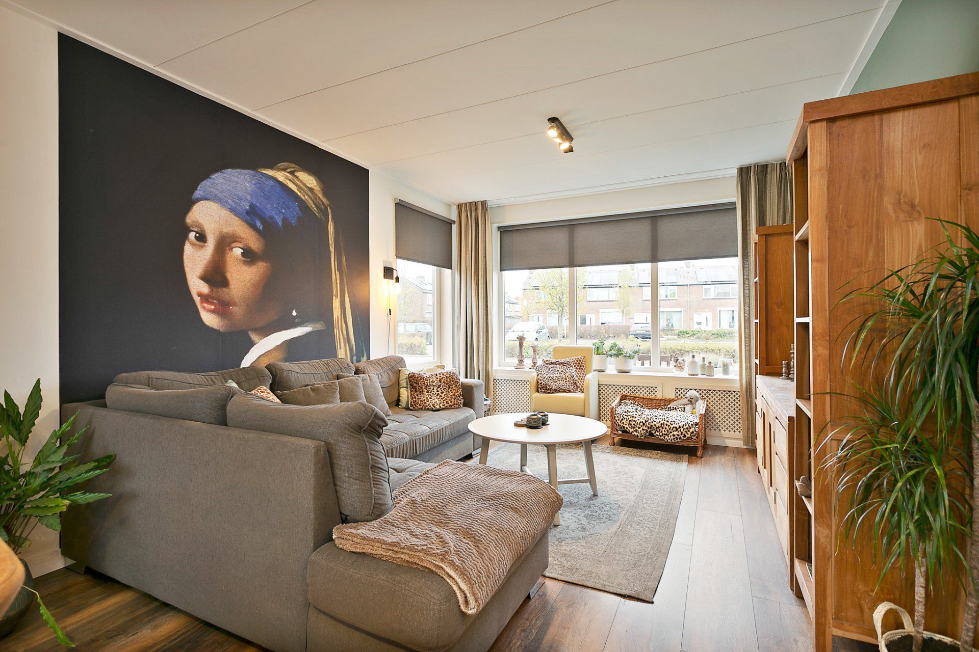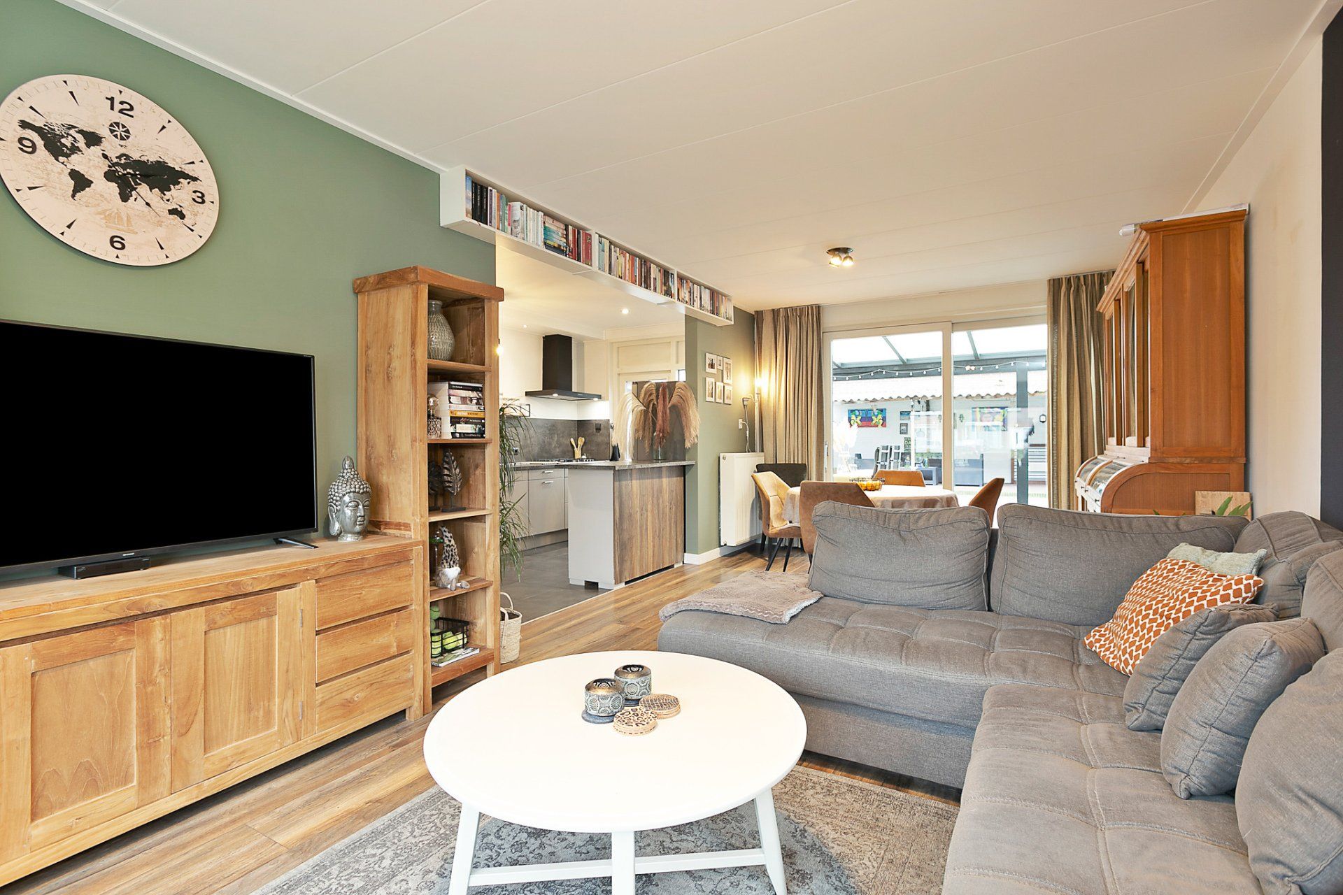 De woonkamer is voorzien van een laminaatvloer en de kunststof kozijnen bevatten dubbel glas. Aan de achterzijde is het raam vervangen door een kunststof schuifpui zodat je, naast de achterdeur in de keuken ook vanuit de woonkamer, directe toegang tot de achtertuin hebt. Over de oude parketvloer is een nette laminaatvloer gelegd.