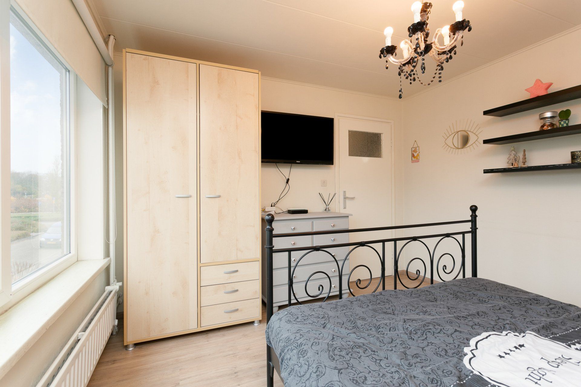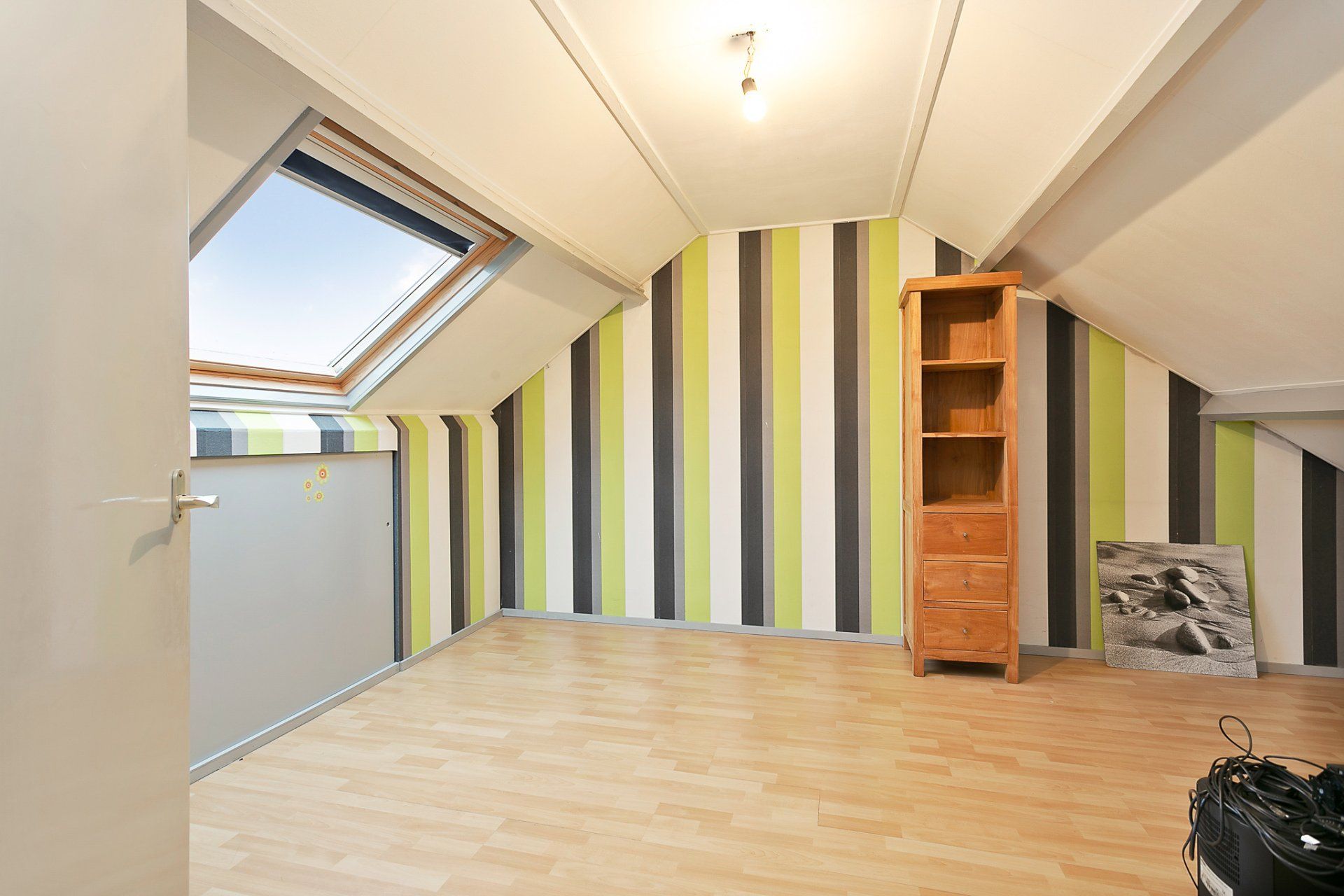 De vierde slaapkamer is met een deur gescheiden van de voorzolder en voorzien van een groot dakraam. Het dak is geïsoleerd en er zijn knieschotten voorzien voor extra opbergruimte. Ook in deze ruime slaapkamer ligt een nette laminaatvloer.